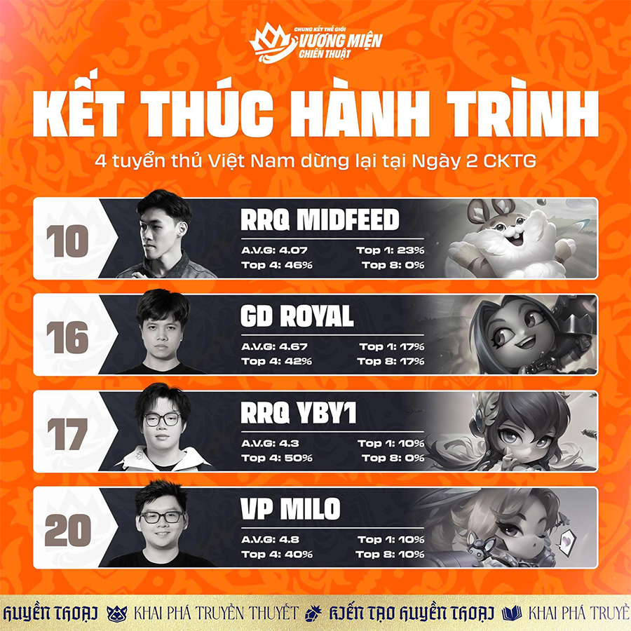 Trong khi đó, tuyển thủ Việt Nam có kết quả tốt nhất tại giải Chung Kết Thế Giới ĐTCL Mùa 16 là RRQ.Midfeed với hạng 10. Thành tích 3 đại diện còn lại lần lượt là GD.Royal (hạng 16), RRQ.YBY1 (hạng 17) và VP.Milo (hạng 20).