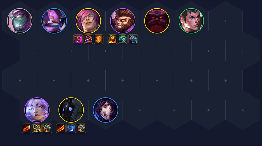 Đội hình gồm 9 tướng phối hợp để kích hoạt các tộc/hệ chính và phụ, đảm bảo Yunara là sát thương chủ lực.