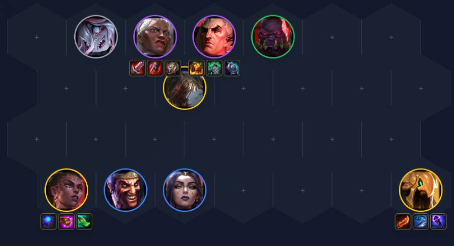 Đội hình gồm 9 tướng với vai trò rõ ràng: Ambessa gây sát thương chủ lực, Mel là pháp sư dồn sát thương, Swain và Sion tạo ra lớp chống chịu, Azir là mũi nhọn xuyên thủng hàng trước.