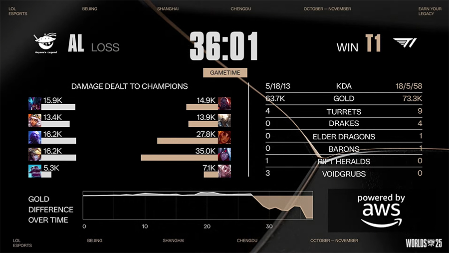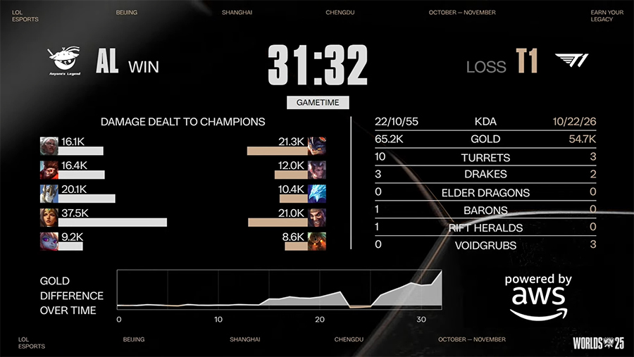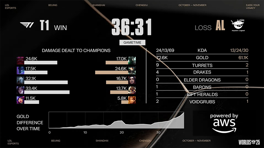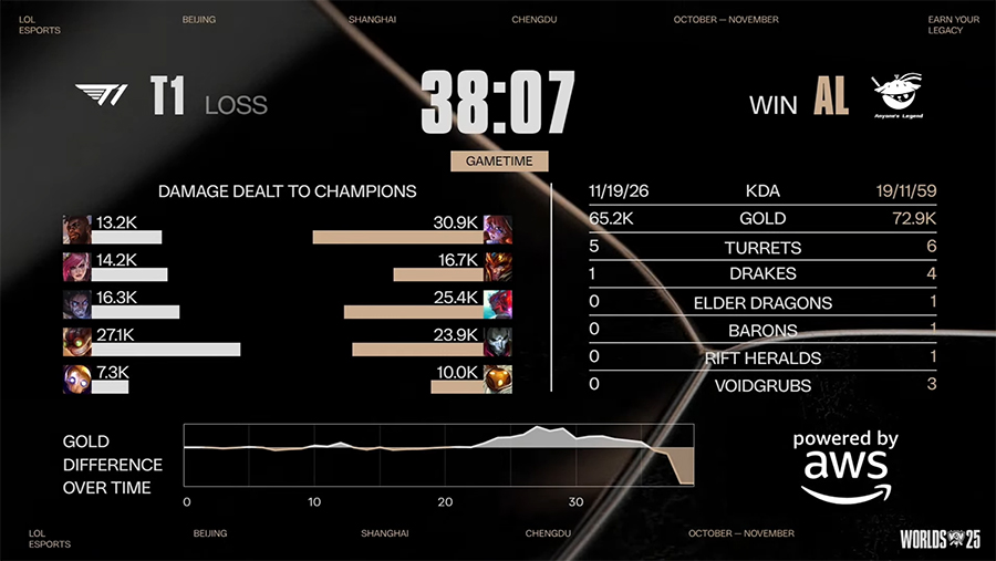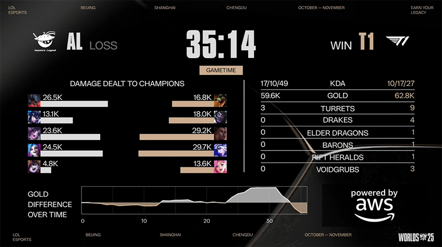 Dù T1 kiểm soát tốt và có lợi thế vàng, bước ngoặt xảy ra khi AL chủ động băng trụ bắt Faker ở đường trên, giành chiến thắng giao tranh dù cả đội T1 kéo đến hỗ trợ. Chỉ còn Keria sống sót. Anyone’s Legend tận dụng thời cơ đó để lấy Linh Hồn Rồng Địa, đồng thời quét sạch mục tiêu lớn với Baron và Rồng Ngàn Tuổi, kết thúc ván đấu ngoạn mục.