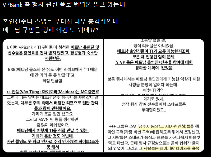 Theo tin đồn từ các trang mạng xã hội FM Korea, X và Facebook, các khách mời + tuyển thủ Việt tham gia fanmeeting VPBank × T1 lần này hoàn toàn không nhận được thù lao, chỉ được hỗ trợ vé máy bay và nơi lưu trú