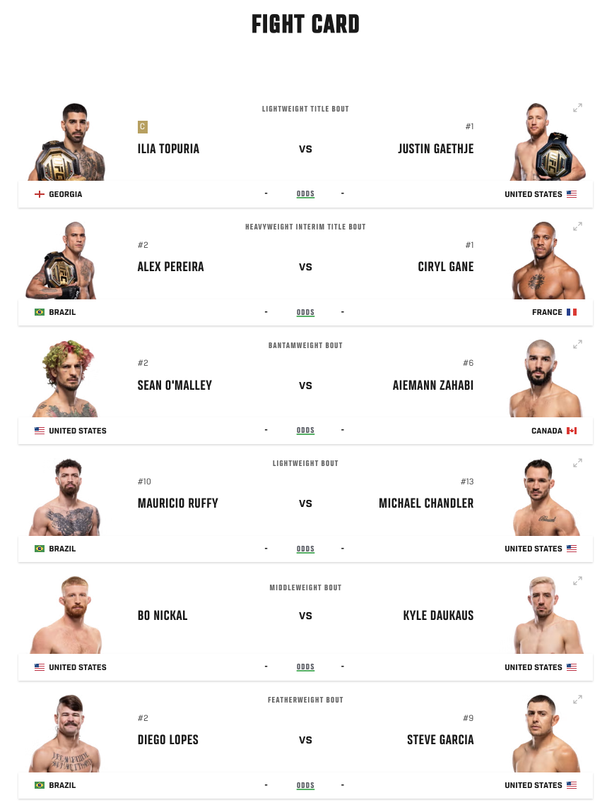 Bỏ qua những tranh cãi, UFC Freedom 250 đang được định hình là một trong những sự kiện hứa hẹn bùng nổ doanh thu truyền hình trả tiền (PPV) lớn nhất lịch sử. Sự kiện dự kiến có 7 trận đấu, dẫn đầu là trận title unification (thống nhất đai vô địch) hạng nhẹ giữa nhà đương kim vô địch Ilia Topuria và nhà vô địch tạm thời Justin Gaethje.