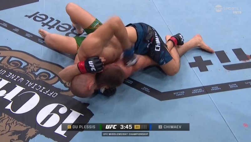 Hiệp 3 một lần nữa chứng kiến Chimaev đè được Du Plessis ở thế crucifix. Lần này, số lượng đòn đấm và chỏ ở thế ground-and-pound được tạo ra mang đến lợi thế sát thương rõ ràng cho võ sĩ người Chechnya.