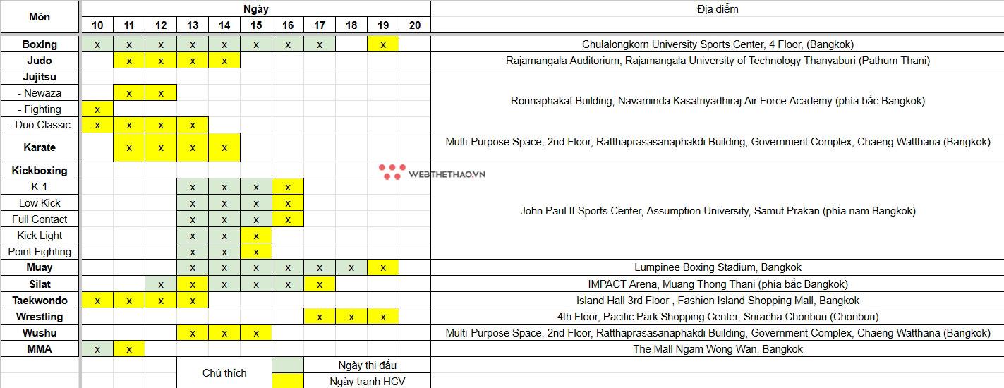Theo công bố của ban tổ chức, các môn võ thuật sẽ thi đấu liên tục từ ngày 10 tới 19/12 tại hai khu vực chính là Bangkok, Pathum Thani và Chonburi. Dưới đây là lịch thi đấu chính thức của các môn võ thuật theo ngày.