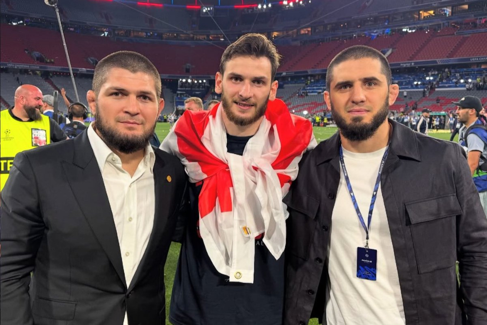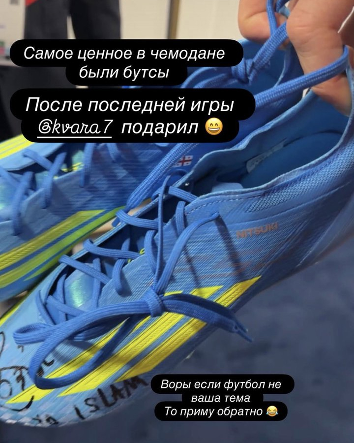 Trước đó vào đầu tuần, Makhachev đã vinh dự nhận được đôi giày "thực chiến" (match-worn) này từ chính tay Kvaratskhelia sau khi dự khán trận lượt đi UEFA Champions League giữa PSG và Liverpool tại Paris.