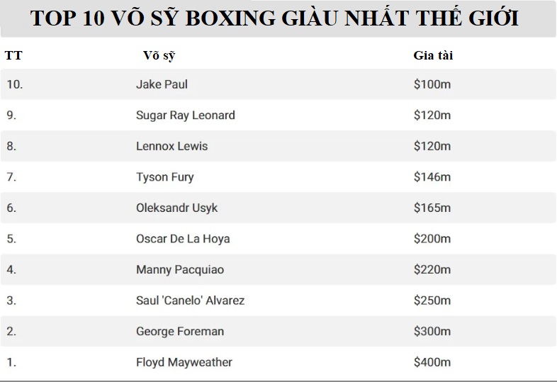 Xếp sau Usyk chính là Tyson Fury, với 146 triệu đô la. Còn youtuber người Mỹ, "boxer tay ngang" Jake Paul yên vị ở thứ 10 với khoảng 100 triệu đô la kiếm được từ khi sỏ găng thượng đài.