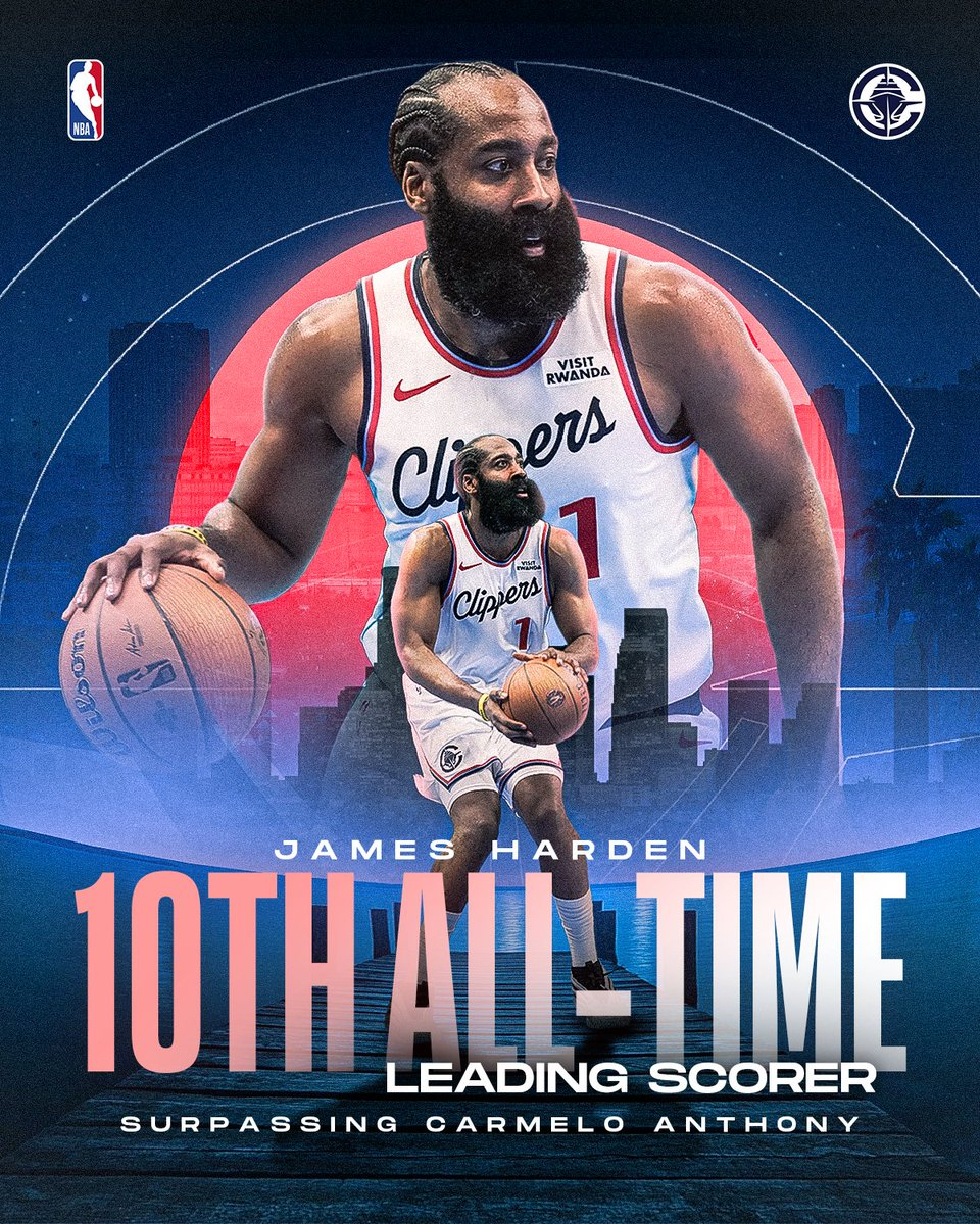 Trong hiệp ba của trận đấu gặp Minnesota Timberwolves, Harden 36 tuổi đã vượt qua Carmelo Anthony để chiếm vị trí thứ 10 trong danh sách ghi điểm mọi thời đại của NBA với 28.290 điểm. LeBron James (thứ nhất) và Kevin Durant (thứ tám) là những cầu thủ đang thi đấu duy nhất xếp trên anh.