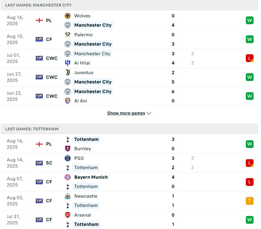 Tổng bàn thắng trong trận: Thống kê chỉ ra rằng, 4/5 trận vừa qua của Man City có tối thiểu 4 bàn/trận. Trận còn lại có đến 3 bàn. 3 trận gần nhất của Tottenham cũng có chỉ số tương tự.