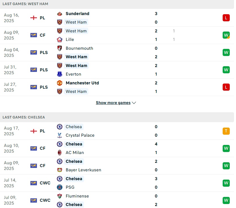 Phong độ và lịch sử đối đầu West Ham vs Chelsea