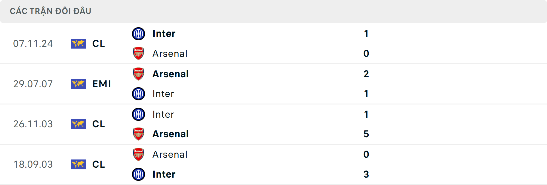 Lịch sử đối đầu Inter Milan vs Arsenal