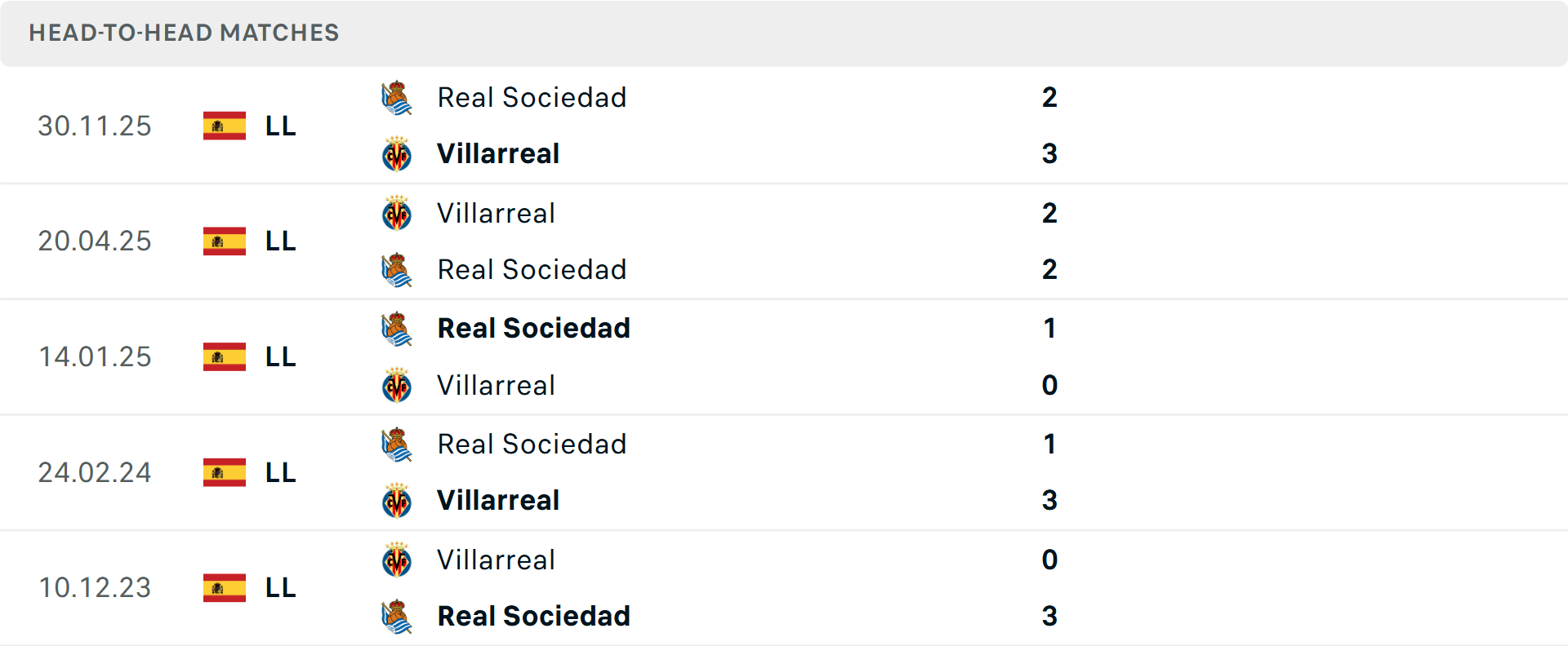 Lịch sử đối đầu Villarreal vs Real Sociedad