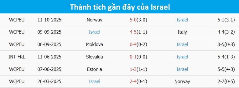 Phong độ Israel 6 trận gần nhất