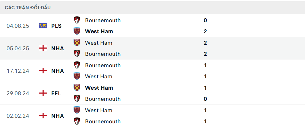 Lịch sử đối đầu lại nghiêng về West Ham khi họ bất bại 8 trận gần nhất trước Bournemouth.