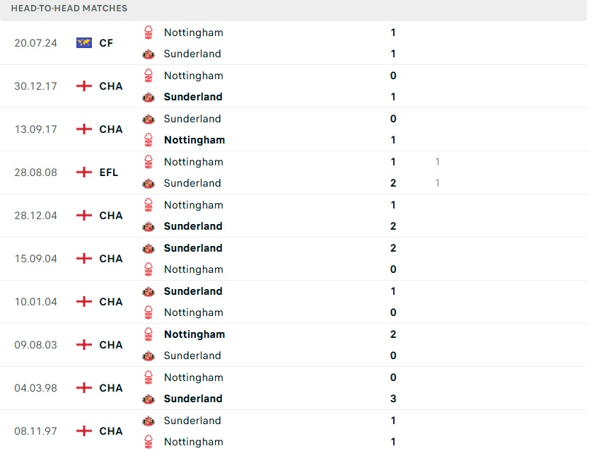 Lịch sử đối đầu Nottingham vs Sunderland
