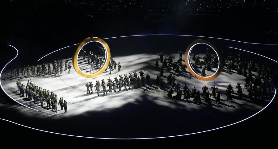 Hai vòng tròn tượng trưng cho Milan và Cortina sau đó được kéo lại gần nhau hơn khi ba chiếc vòng tròn phát sáng khác bay lên không trung, tạo thành biểu tượng Olympic phía trên sân vận động.