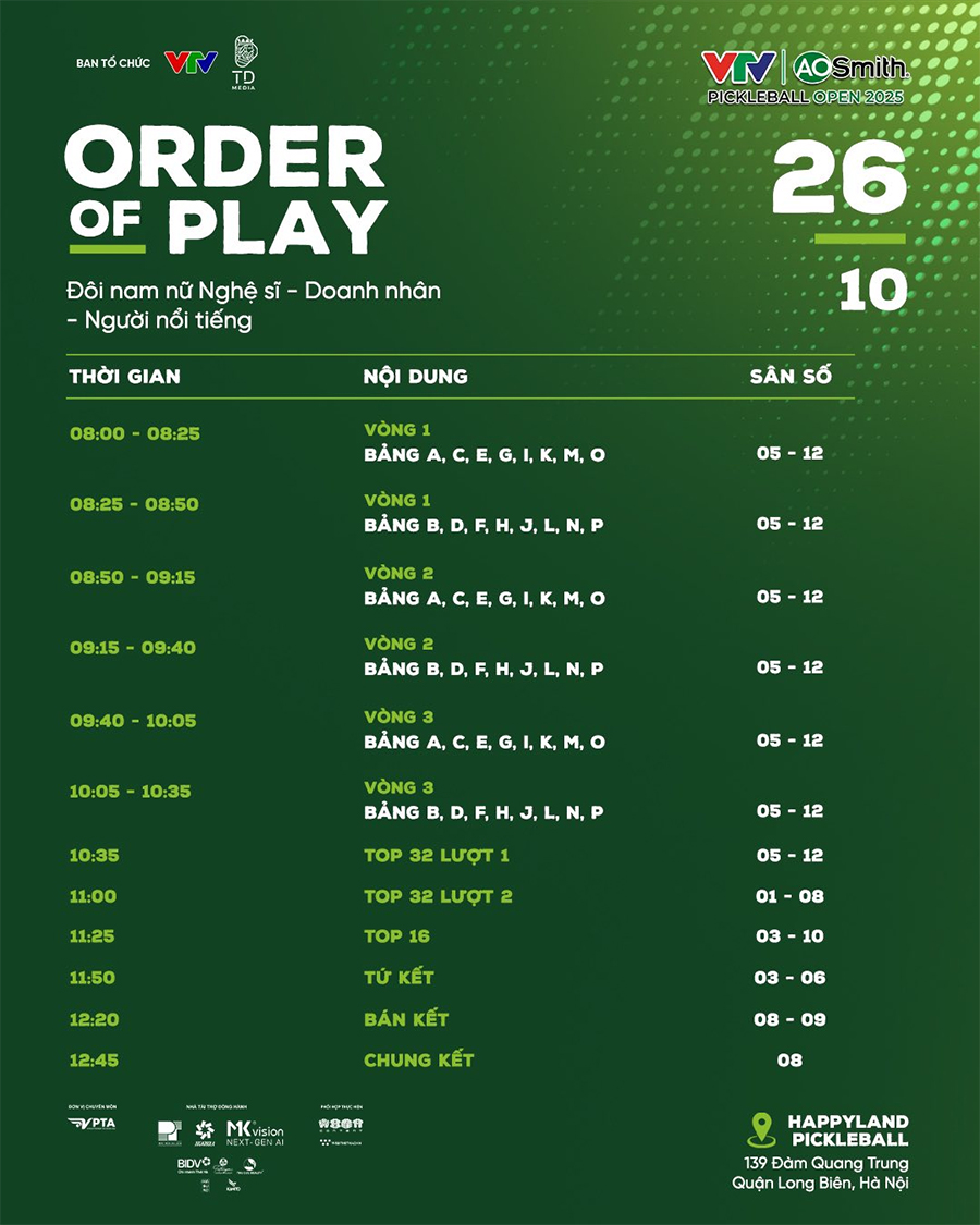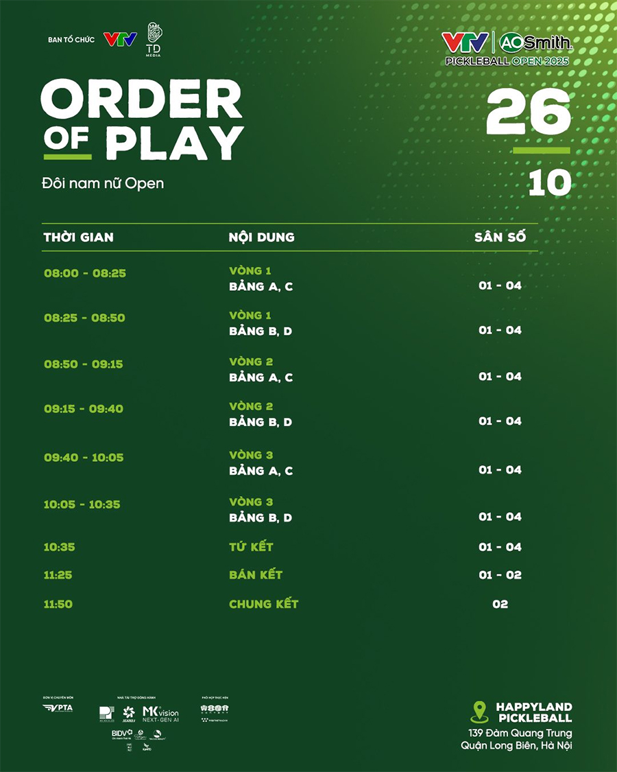 Ngày hôm nay 26/10 sẽ là ngày thi đấu cuối cùng của VTV A.O. SMITH Pickleball Open 2025. Giải đấu hứa hẹn sẽ bùng nổ với những hạng mục thi đấu được quan tâm nhiều nhất: Đôi Open (Đôi nam, đôi nam nữ), Đôi nam nữ Doanh nhân - KOLs - Nghệ sỹ. Sau đây là lịch thi đấu chi tiết: