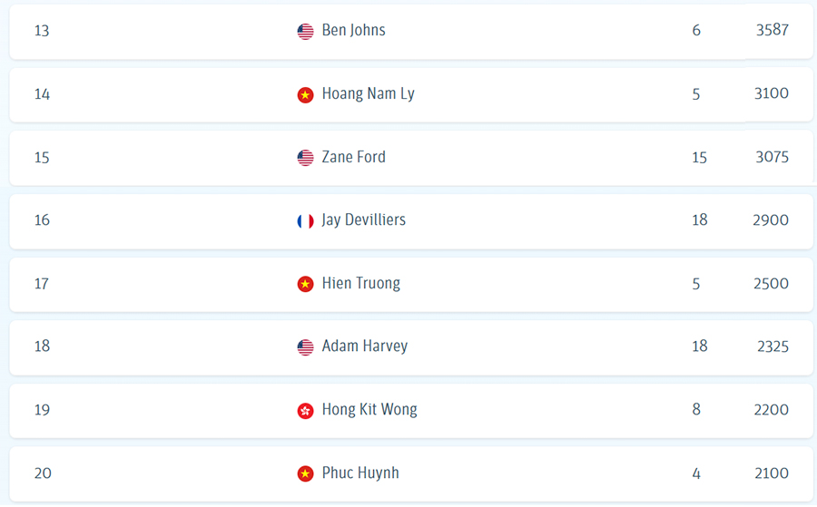 Không dừng lại ở đó, Trương Vinh Hiển cũng ghi dấu ấn mạnh mẽ khi leo lên hạng 17 với 2.500 điểm. Việc hai đại diện Việt Nam cùng góp mặt trong top 20 là cột mốc mang tính lịch sử, phản ánh sự tiến bộ nhanh chóng cả về chuyên môn lẫn kinh nghiệm thi đấu quốc tế.