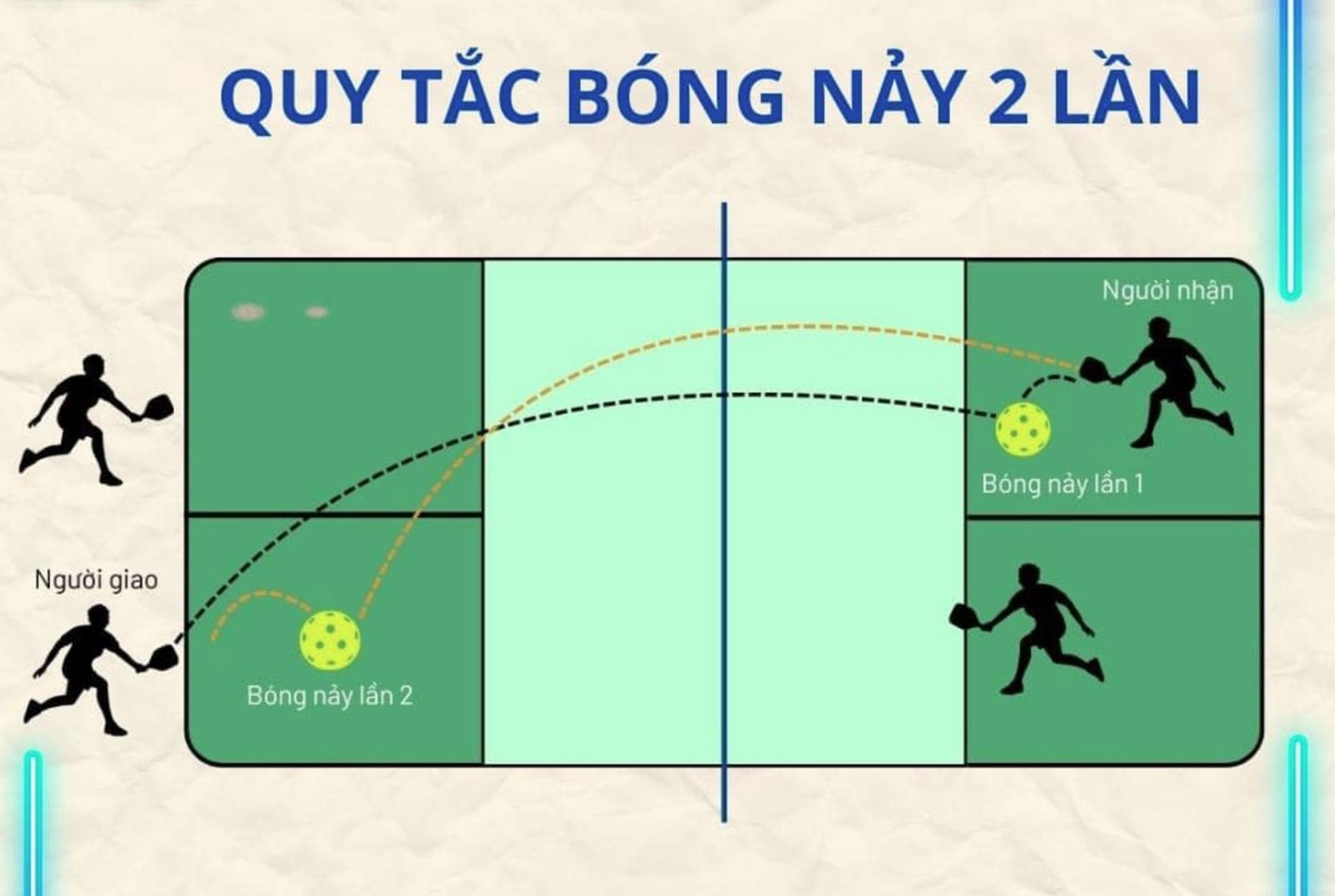 Luật "hai nảy" (double bounce rule) quy định rằng sau khi giao bóng, mỗi đội phải để bóng chạm sân một lần trước khi được phép đánh volley (đánh bóng trước khi chạm đất). Nhiều người mới thường quên quy tắc này và vội vàng lên lưới đánh volley ngay sau khi giao bóng hoặc đỡ giao bóng.