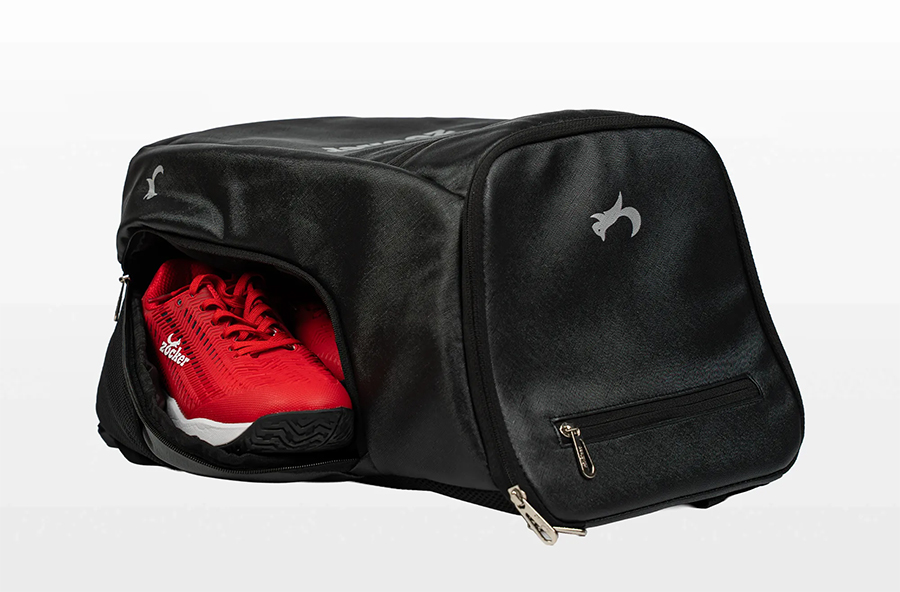 Phía bên hông còn có ngăn chun linh hoạt để đựng bình nước hoặc bóng pickleball, cùng ngăn giày riêng biệt bên phải giúp tách biệt đồ sạch – bẩn khi di chuyển.