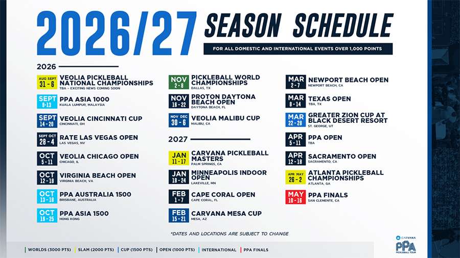 Lịch trình năm nay đánh dấu sự trở lại của những sự kiện mang tính biểu tượng như Pickleball World Championships tại Dallas (Texas) và PPA Finals ở San Clemente (California). Bên cạnh đó là các chặng đấu được mong chờ tại Kuala Lumpur, Brisbane và Hong Kong.