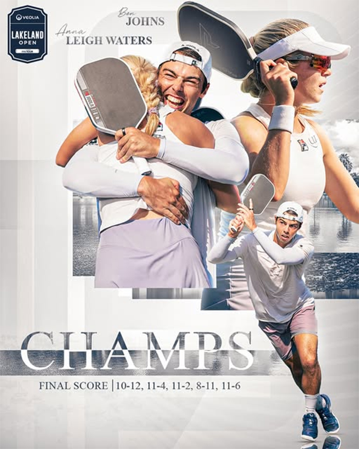 Anna Leigh Waters và Ben Johns mở màn Carvana Championship Sunday tại Florida bằng chiến thắng đầy kịch tính 10-12, 11-4, 11-2, 8-11, 11-7 trước cặp hạt giống số 2 Jorja Johnson/JW Johnson để lên ngôi vô địch nội dung đôi nam – nữ.