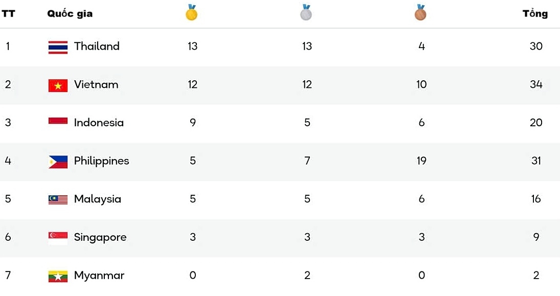 Bảng tổng sắp huy chương SEA Games 33 sau ngày thi đấu 16/12: Đoàn thể thao Việt Nam có một ngày thi đấu thành công, qua đó áp sát vị trí thứ 2 của Indonesia.
