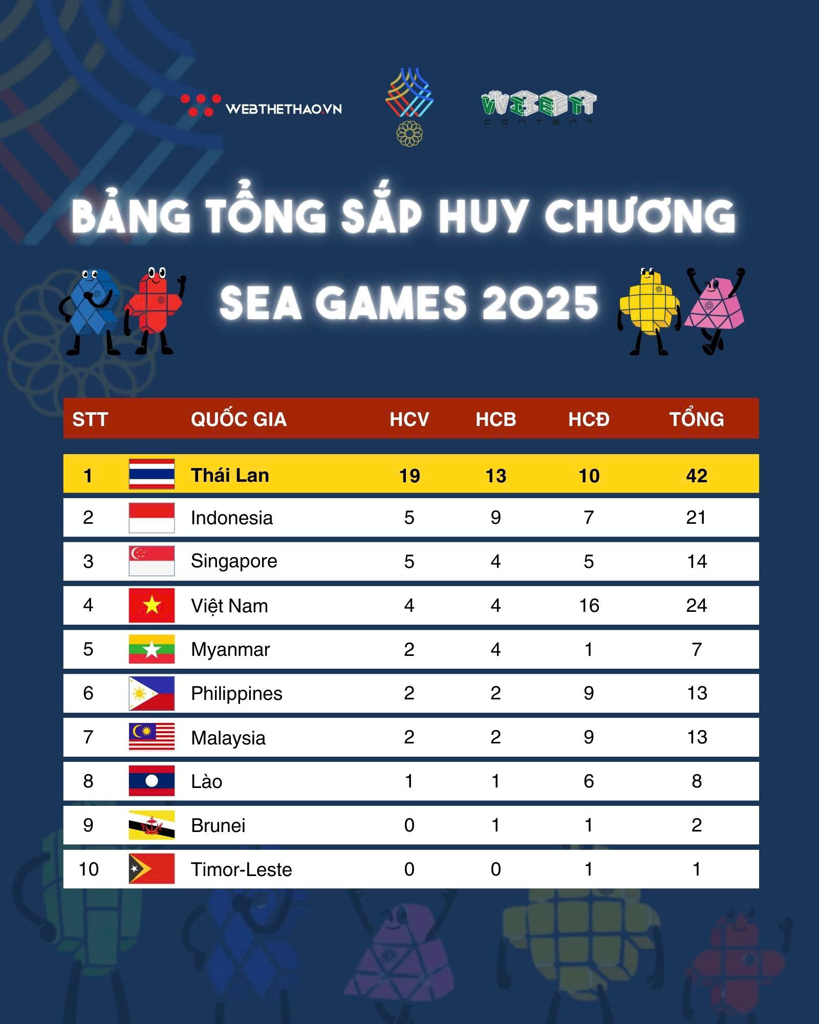 Bảng tổng sắp huy chương SEA Games 33 sau ngày thi đấu chính thức đầu tiên 10/12 chứng kiến sự vượt trội của chủ nhà Thái Lan, còn Việt Nam mới có 4 HCV.