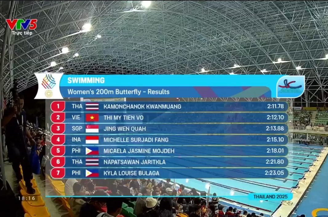 Ở nội dung 200 mét bơi bướm, Võ Thị Mỹ Tiên về đích sau VĐV đội chủ nhà với cách biệt sít sao. Kình ngư 20 tuổi này đạt thành tích 2:12.10, trong khi Kamonchanok Kwanmuang là 2:11:78.