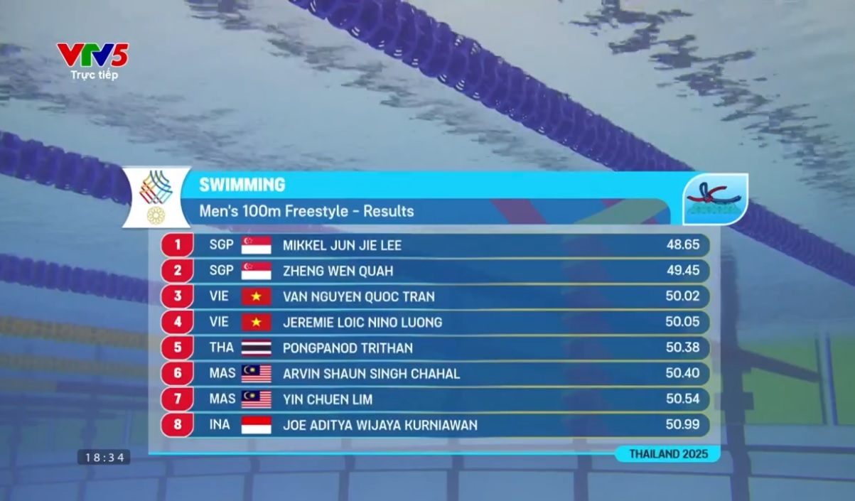 Ở nội dung 100 mét tự do nam, kình ngư 17 tuổi Trần Văn Nguyễn Quốc tiếp tục cho thấy sự tiến bộ của mình. Trong lần đầu tiên tham dự SEA Games, VĐV đến từ Đà Nẵng này đã xuất sắc giành huy chương đồng với thành tích 50.02, sau hai VĐV của Singapore. Trong khi đó, Jeremie Loic Nino Lương chỉ về đích thứ tư (50.05).