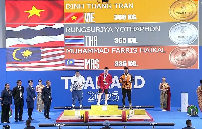 Trong phần thi cử giật, tình huống tranh cãi khi trọng tài thay đổi kết quả đã khiến không ít người tiếc nuối, nhưng Trần Đình Thắng vẫn giữ được bình tĩnh và thể hiện đẳng cấp ở phần cử đẩy để đạt tổng cử ấn tượng 366 kg, qua đó khẳng định bản lĩnh thi đấu tuyệt vời trên sân chơi khu vực.