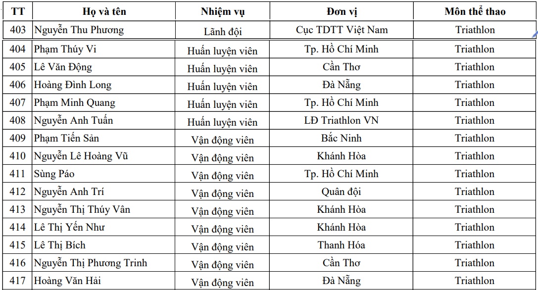 Dưới đây là danh sách đội tuyển triathlon Việt Nam dự SEA Games 2025
