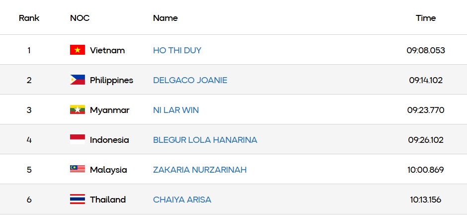 Ở chung kết nội dung Thuyền đơn nữ hạng nhẹ, Hồ Thị Duy giành HCV một cách đầy thuyết phục. Cô bứt lên ngay từ khi xuất phát và duy trì ưu thế của mình cho đến khi về đích. Duy vượt qua đối thủ Philippines với khoảng cách lên tới 6 giây và người về thứ ba của Myanmar là 15 giây.