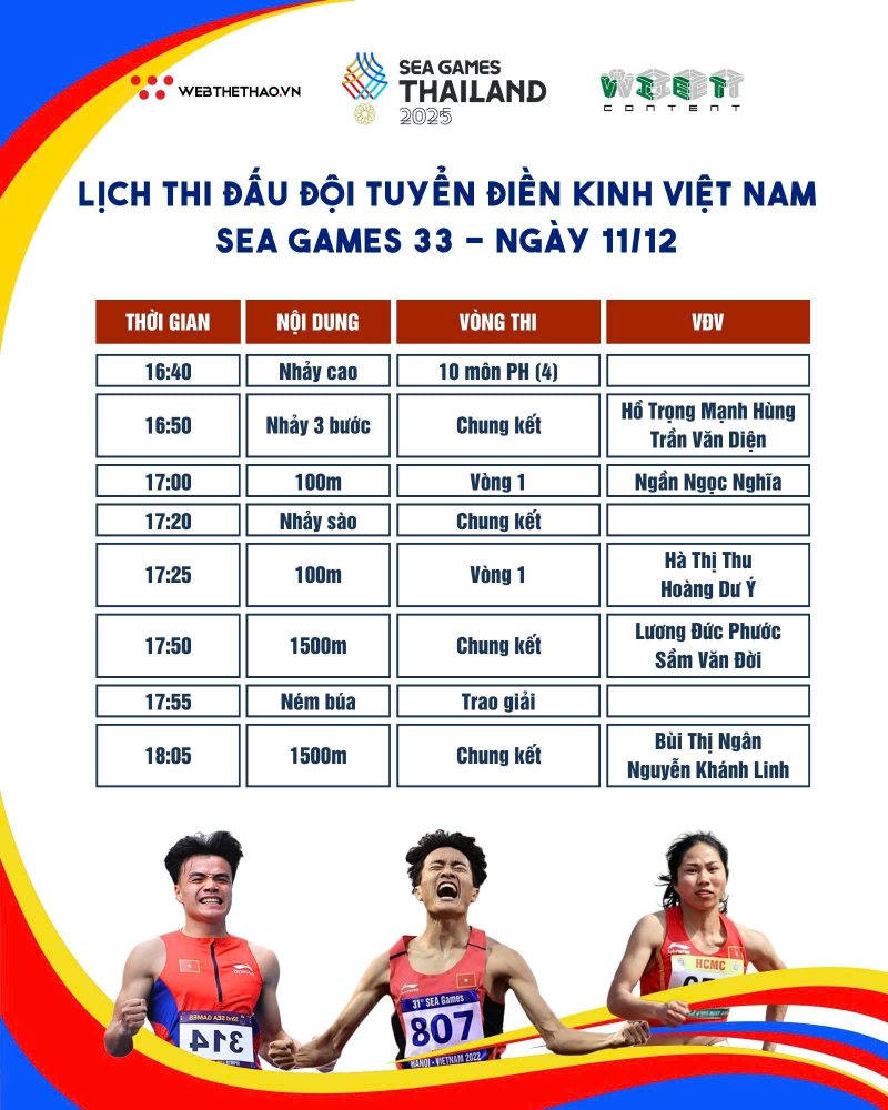 Dưới đây là chi tiết Lịch thi đấu Điền kinh SEA Games 33 ngày 11-12 của đội tuyển điền kinh Việt Nam.