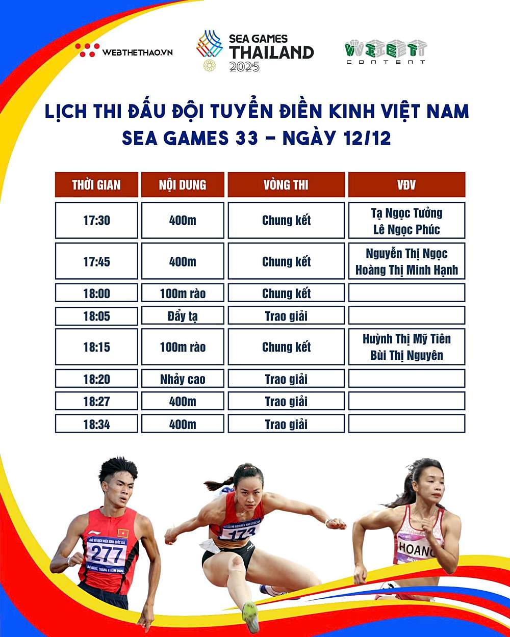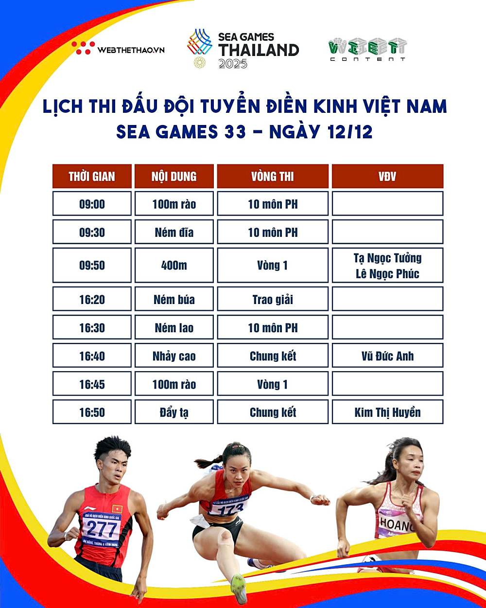 Dưới đây là Lịch thi đấu Điền kinh SEA Games 33 ngày 12-12 của đội tuyển điền kinh Việt Nam.