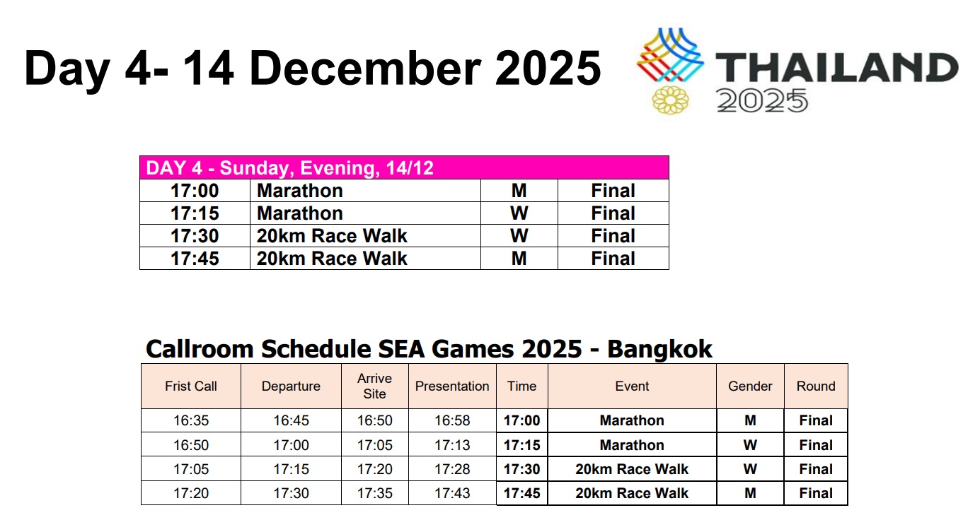 Lịch thi đấu môn Điền kinh SEA Games ngày 14-12 sẽ chứng kiến những nội dung thi đấu siêu bền bỉ diễn ra đó là marathon nam - nữ, đi bộ 20 km nam - nữ.