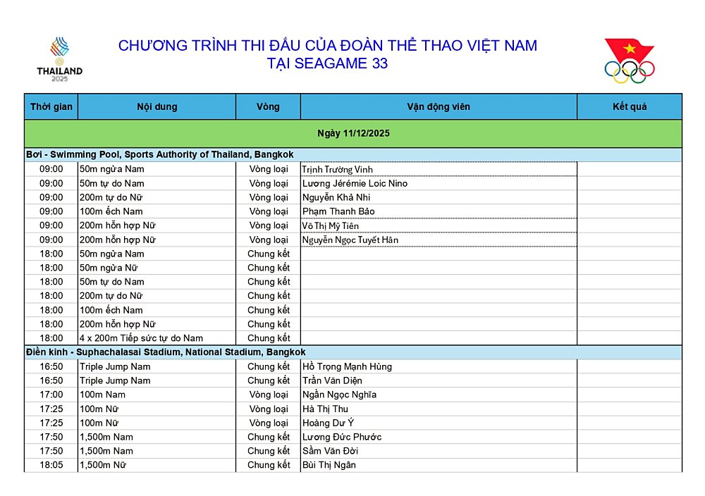 Trong đó, sự diện của đội tuyển chủ lực săn HCV - đội điền kinh quốc gia thu hút nhiều sự chú ý. Dưới đây là chi tiết Lịch thi đấu Đoàn Thể thao Việt Nam ở SEA Games 33 ngày 11-12.