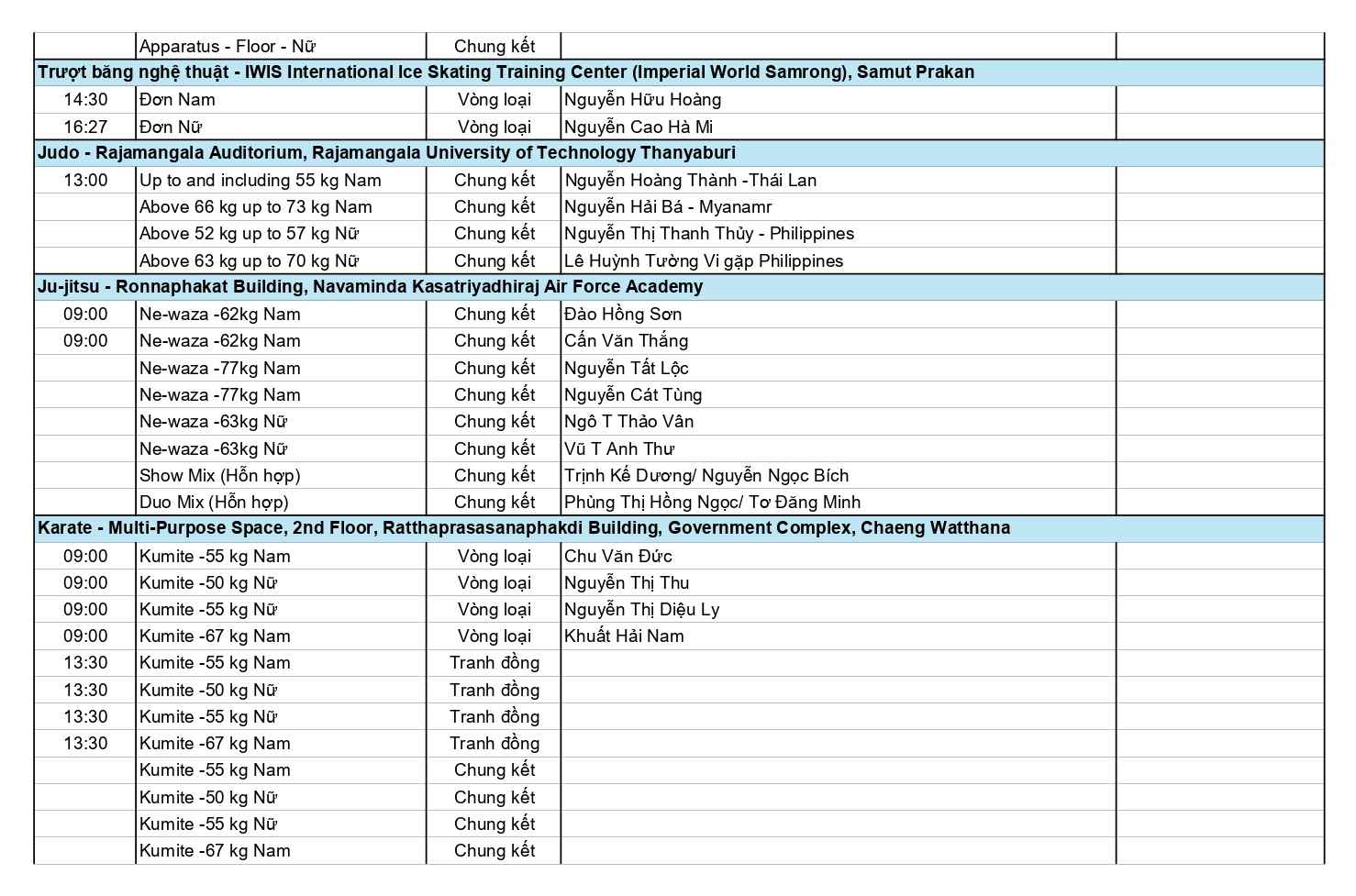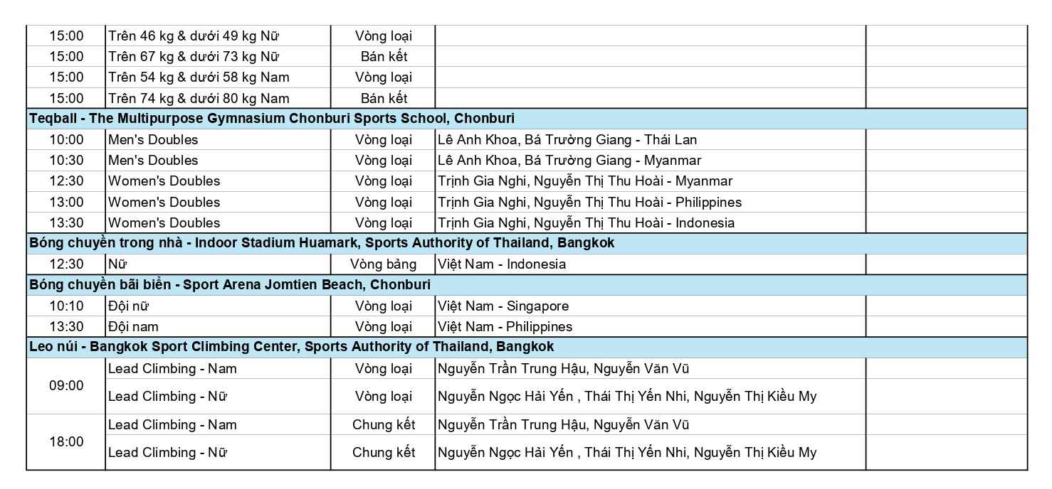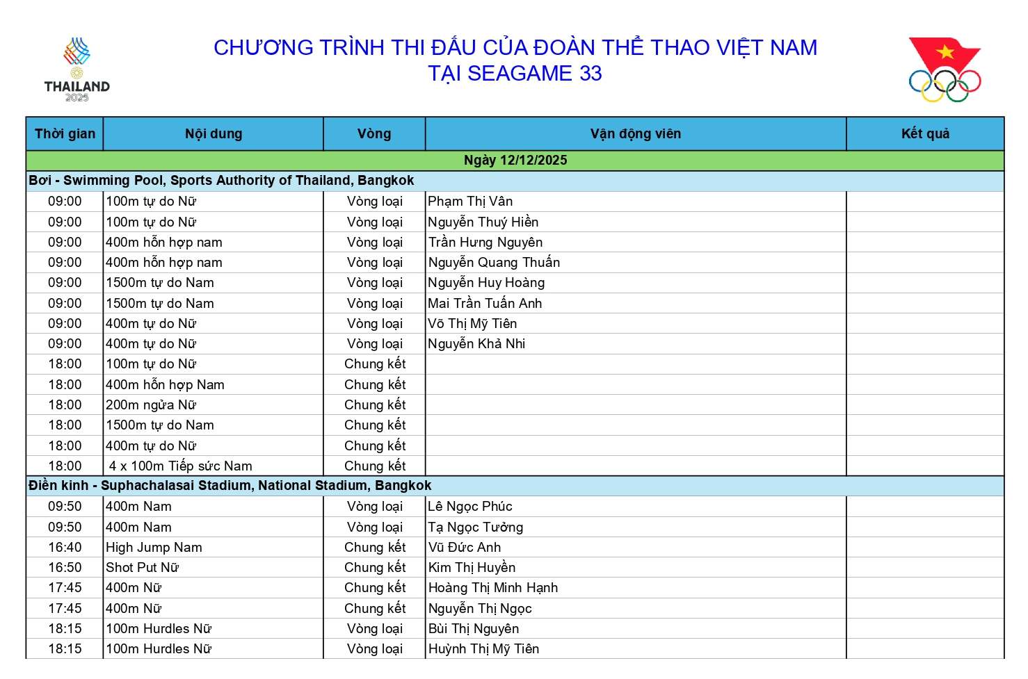 Ngoài ra, những tấm HCV được dự báo sẽ tiếp tục đến từ 2 nhóm môn Olympic cơ bản là điền kinh và bơi. Dưới đây là chi tiết Lịch thi đấu Đoàn Thể thao Việt Nam ở SEA Games 33 ngày 12-12.