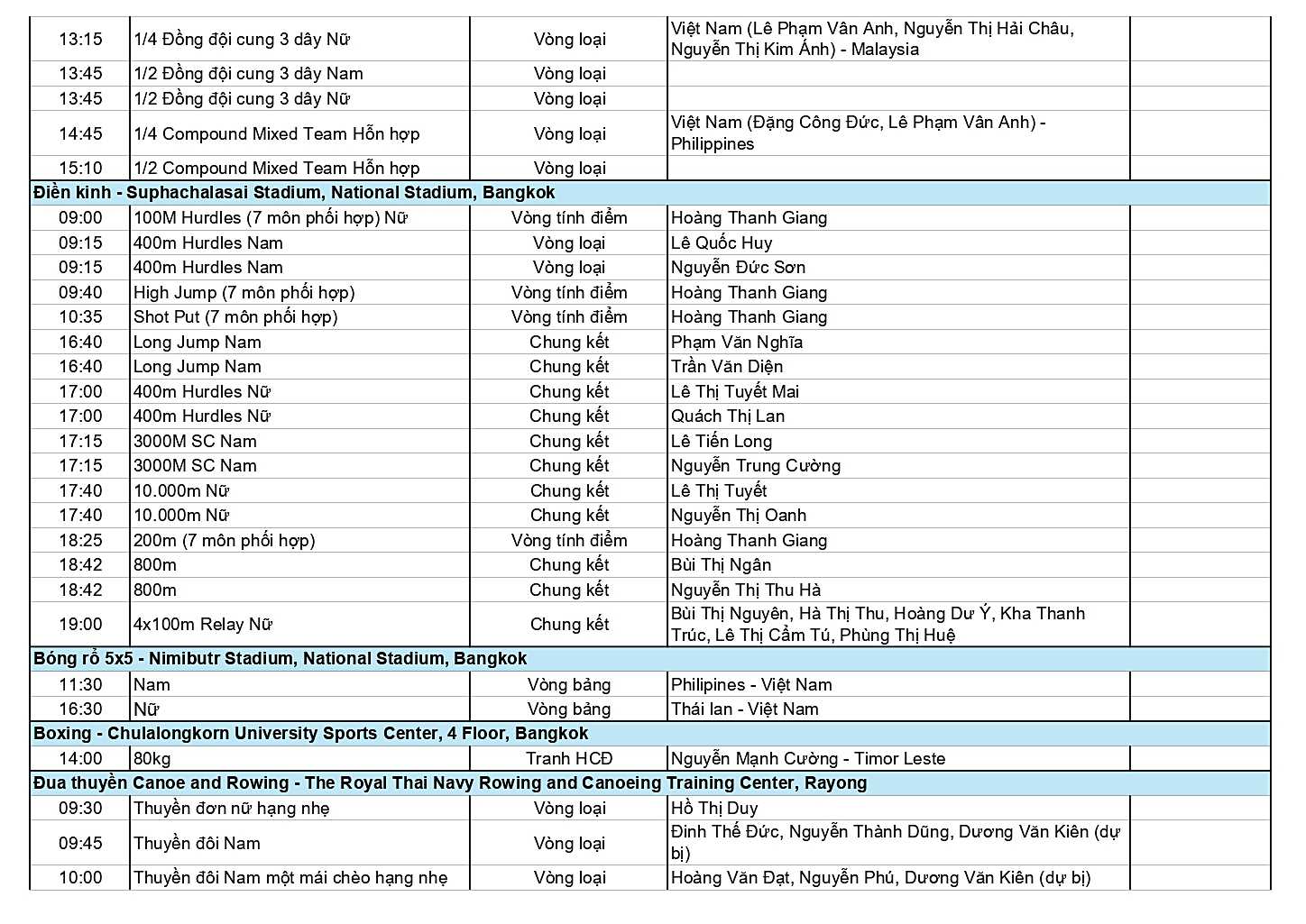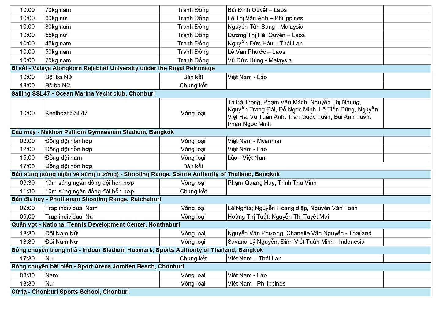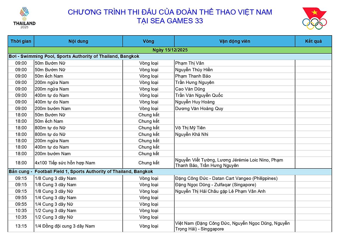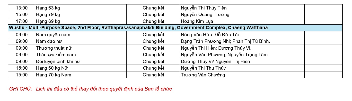 Dưới đây là chi tiết Lịch thi đấu Đoàn Thể thao Việt Nam SEA Games 33 ngày 15-12.