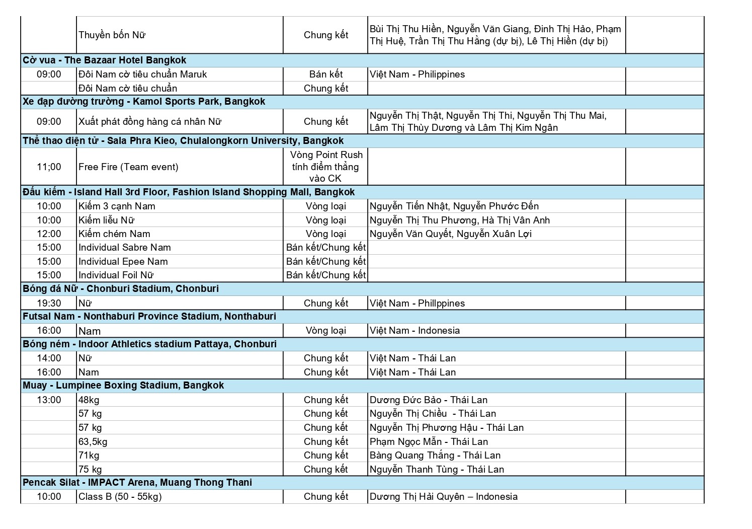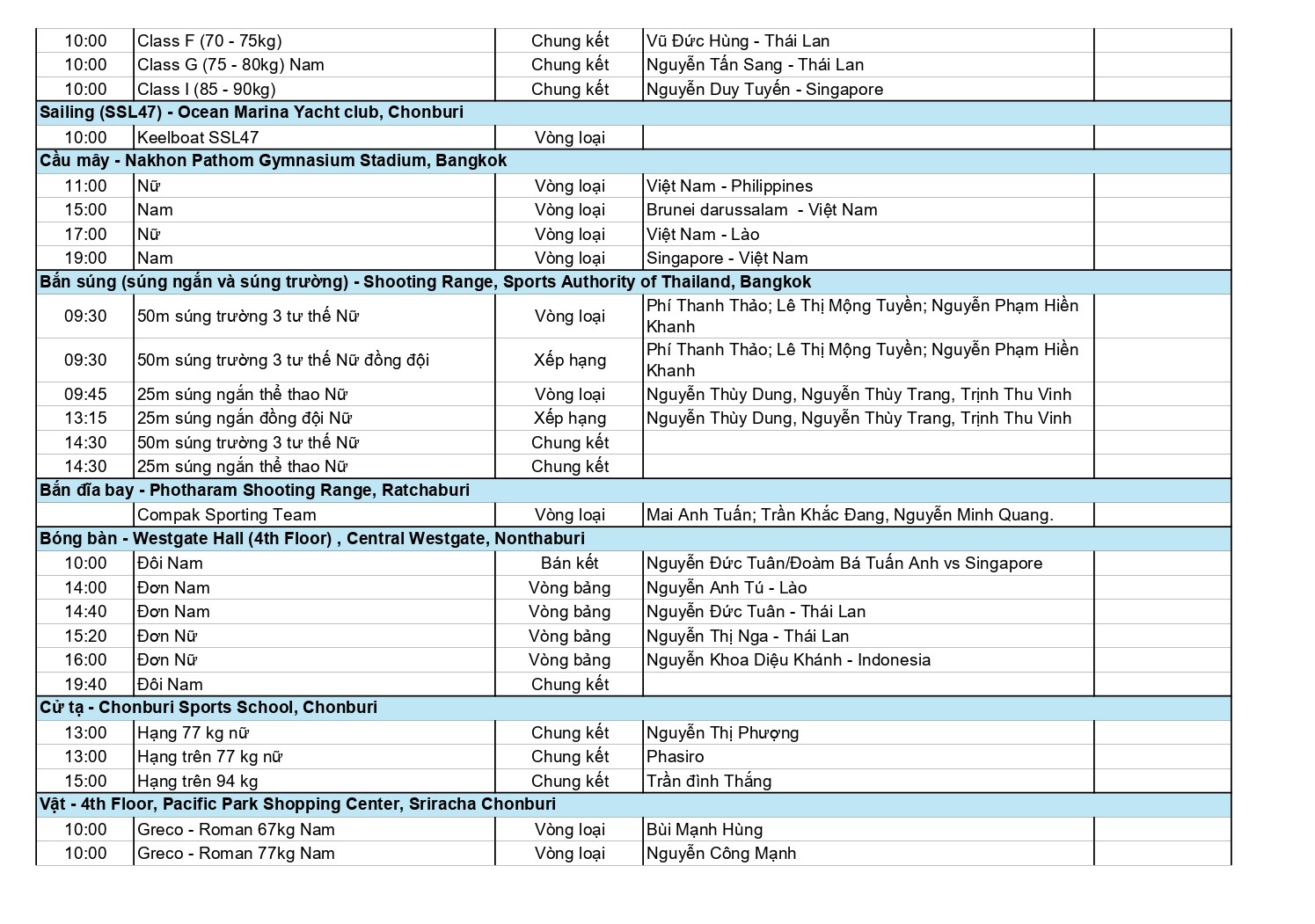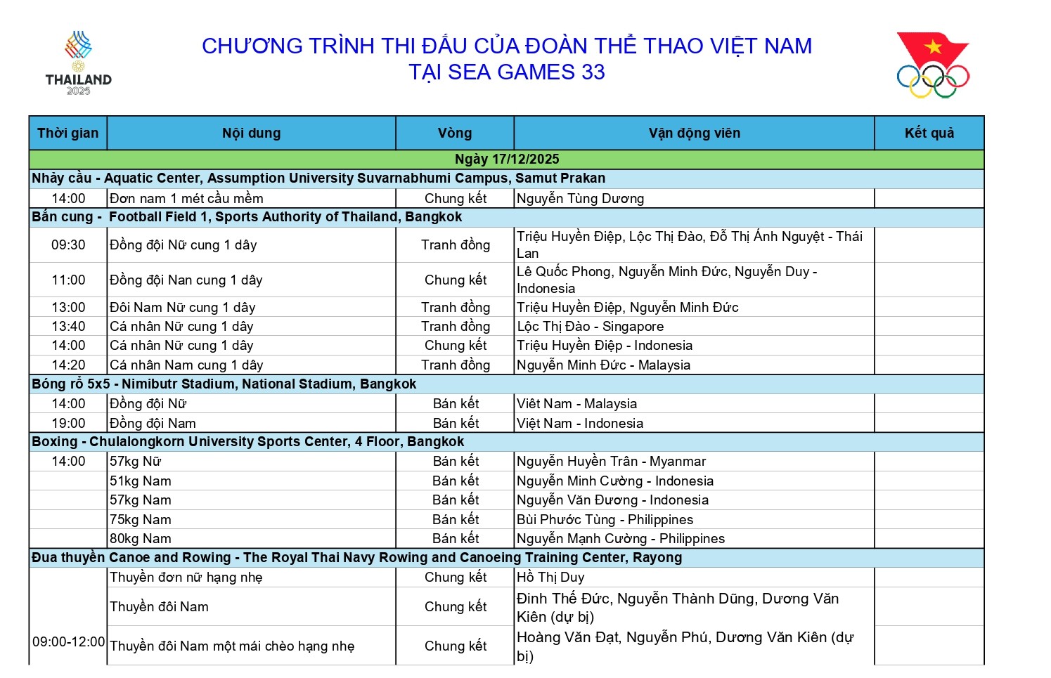 Lịch thi đấu Đoàn Thể thao Việt Nam SEA Games 33 ngày 17-12