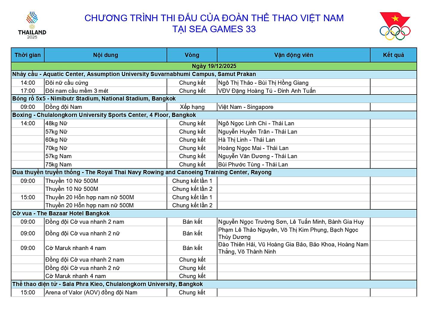 Hôm nay ngày 19-12, ngày áp chót của SEA Games vẫn mang đến nhiều nội dung thi đấu hấp dẫn với cơ hội giành HCV cho VĐV Đoàn Thể thao Việt Nam. Dưới đây là chi tiết Lịch thi đấu Đoàn Thể thao Việt Nam ở SEA Games 33 ngày 19-12.