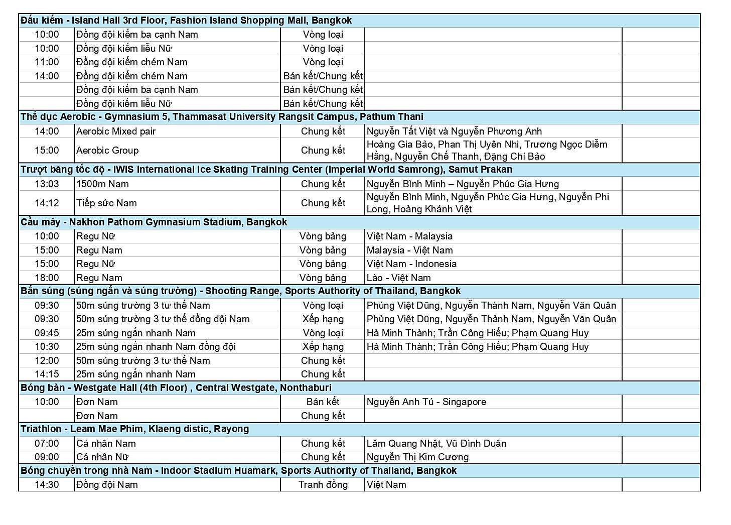 Cũng ở buổi sáng nhiều khả năng sẽ có thêm HCV từ đua thuyền rồng truyền thống, cờ vua, hay thậm chí là vật. Trong 2 ngày vừa qua môn vật đã góp tới 7 tấm HCV và gần như chắc chắn chúng ta sẽ giành tối đa chiến thắng ở 4 nội dung đấu hôm nay.