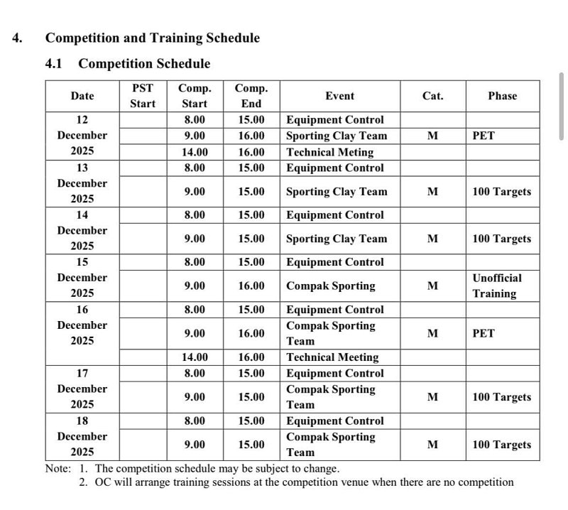 Dưới đây là chi tiết Lịch thi đấu bắn súng SEA Games 2025 - Nội dung bắn đĩa bay thể thao