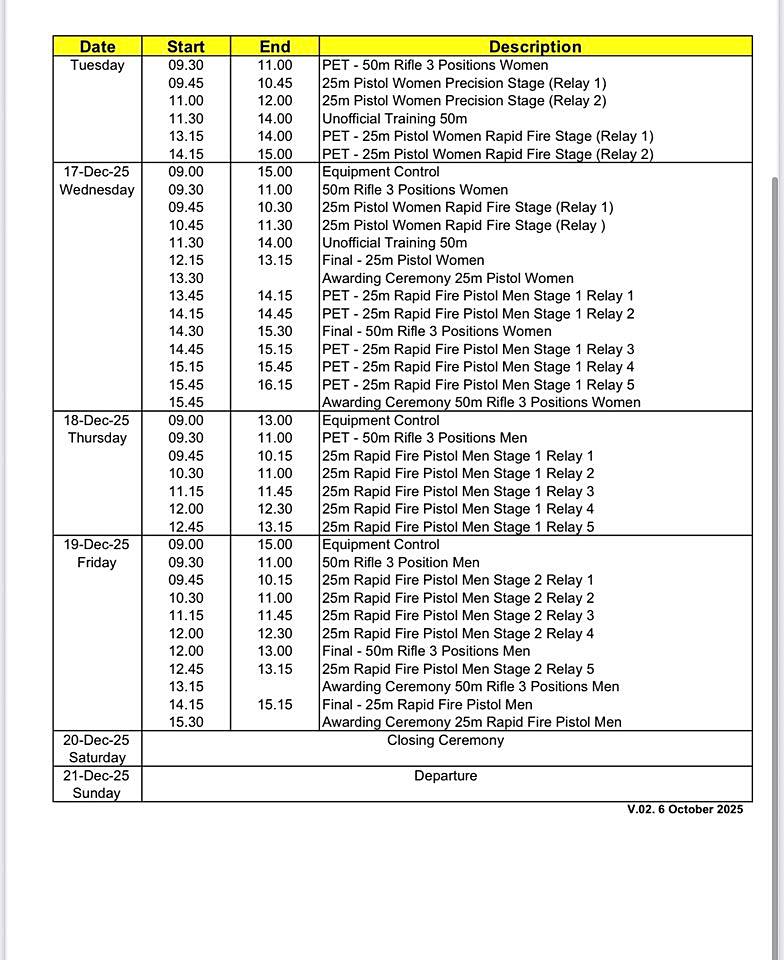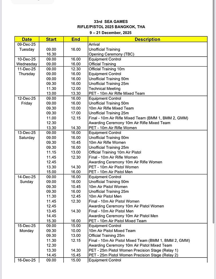 Theo thông báo từ Ban tổ chức SEA Games 2025, Lịch thi đấu môn bắn súng ở đại hội tới đây, với hai nội dung súng ngắn và súng trường sẽ diễn ra từ ngày 9-19/12. Theo đó, từ ngày 9-11/12 sẽ tiếp đón các đoàn quốc gia tới tham dự, họp chuyên môn kỹ thuật, kiểm tra trang thiết bị thi đấu, tập luyện...