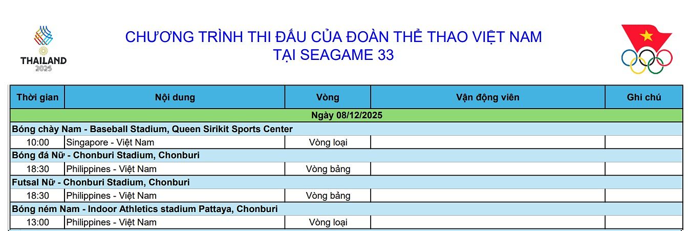 Lịch thi đấu SEA Games 2025 của đoàn Thể thao Việt Nam thứ Hai ngày 8/12 sẽ liên tục được Webthethao cập nhật chi tiết tại đây.