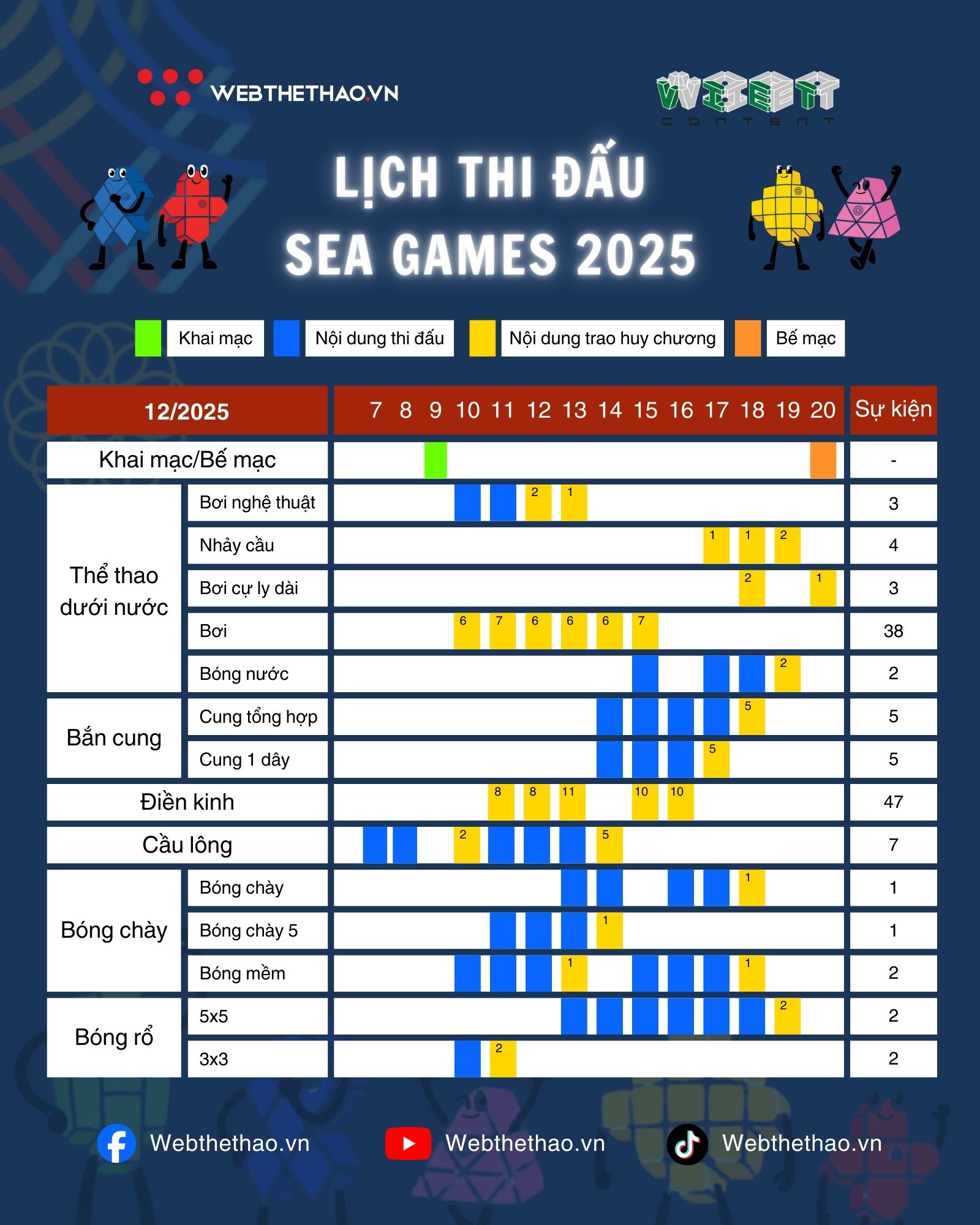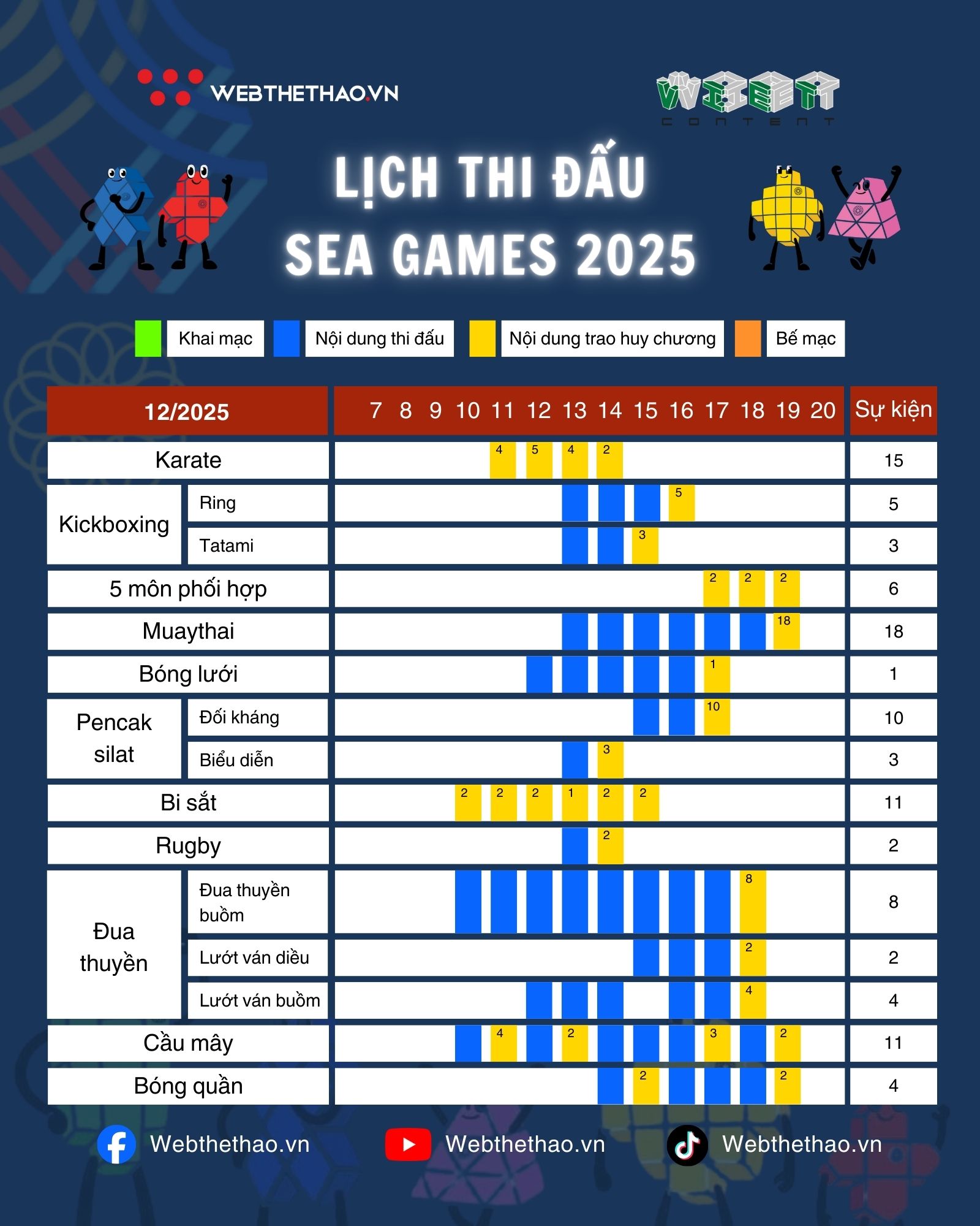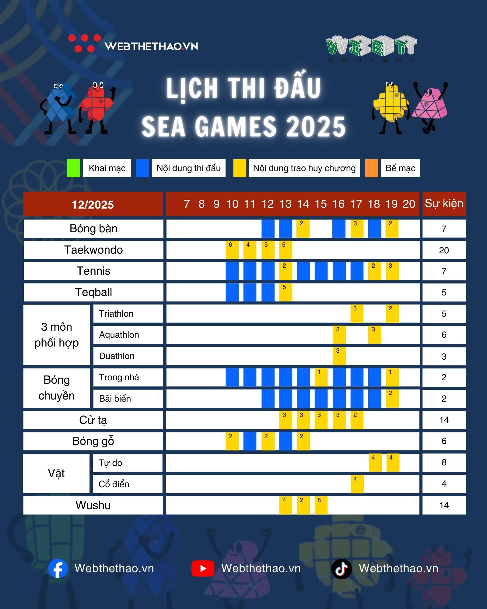 Lịch thi đấu chi tiết, đầy đủ thông tin từ các môn thi đấu của SEA Games 2025 sẽ liên tục được Webthethao cập nhật tại đây.