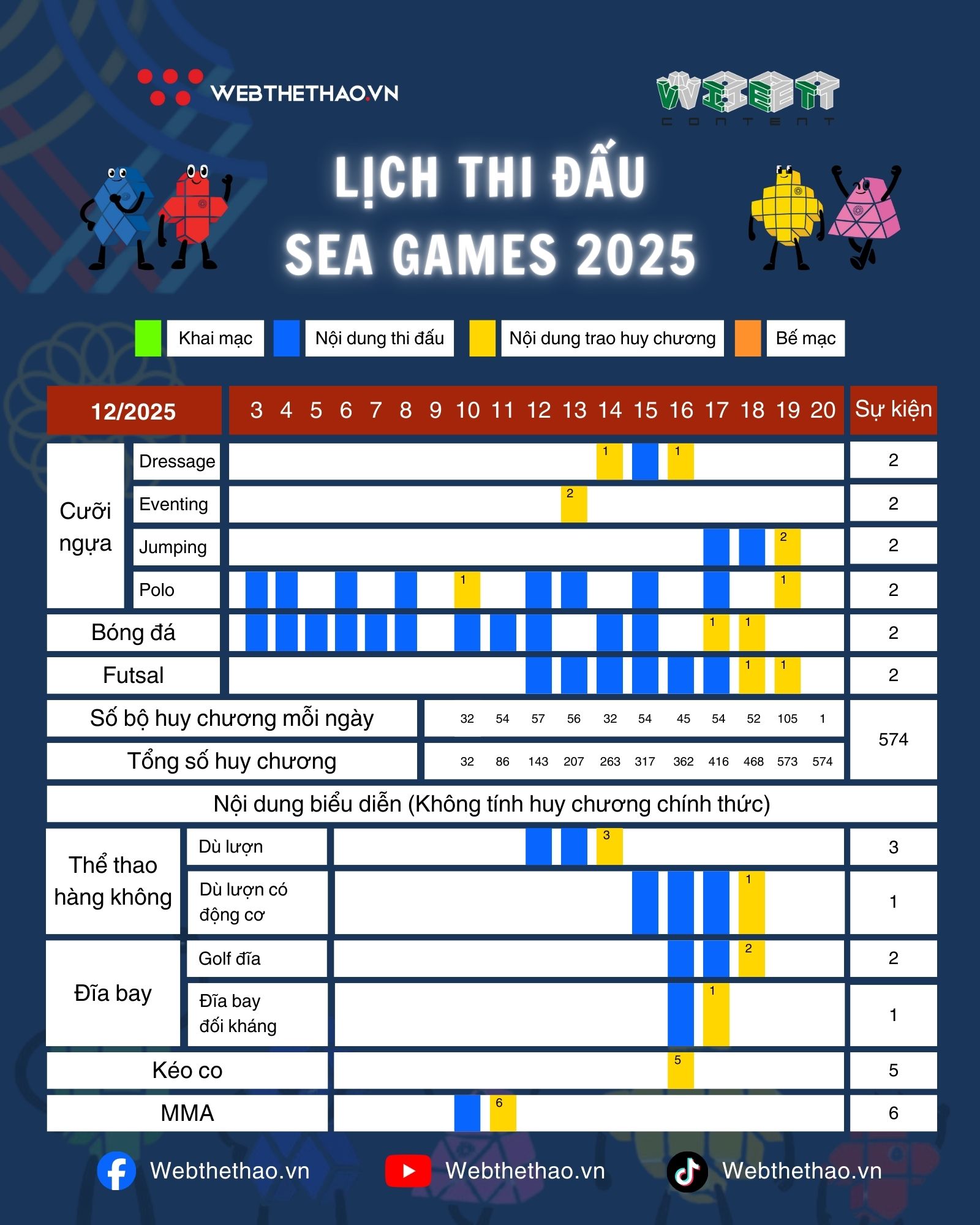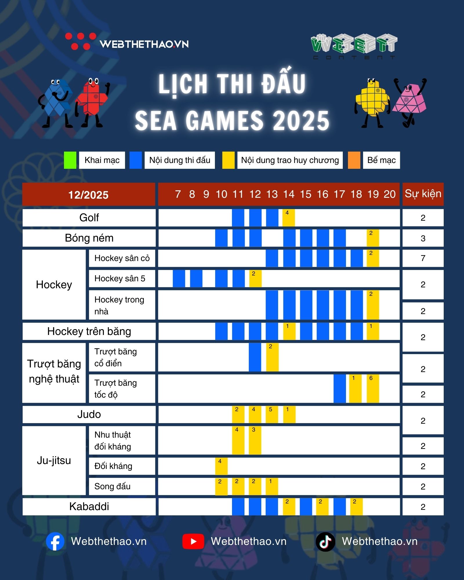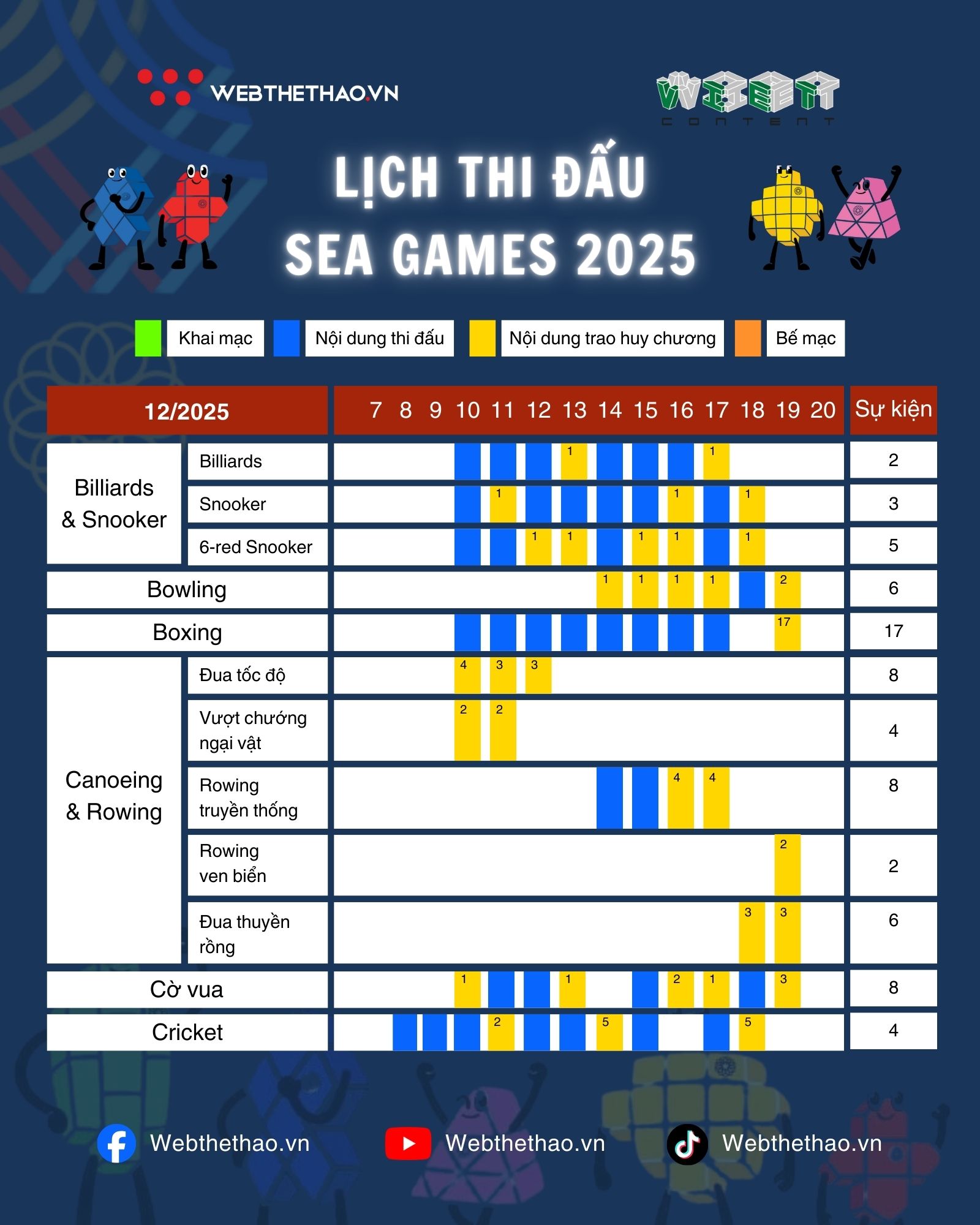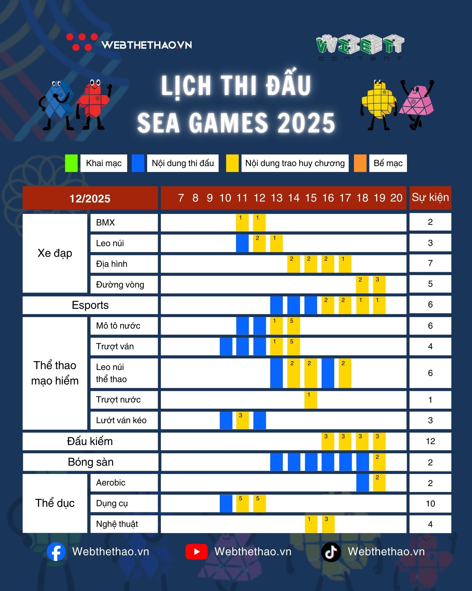 Lịch thi đấu chi tiết, đầy đủ thông tin từ các môn thi đấu của SEA Games 2025 sẽ liên tục được Webthethao cập nhật tại đây.