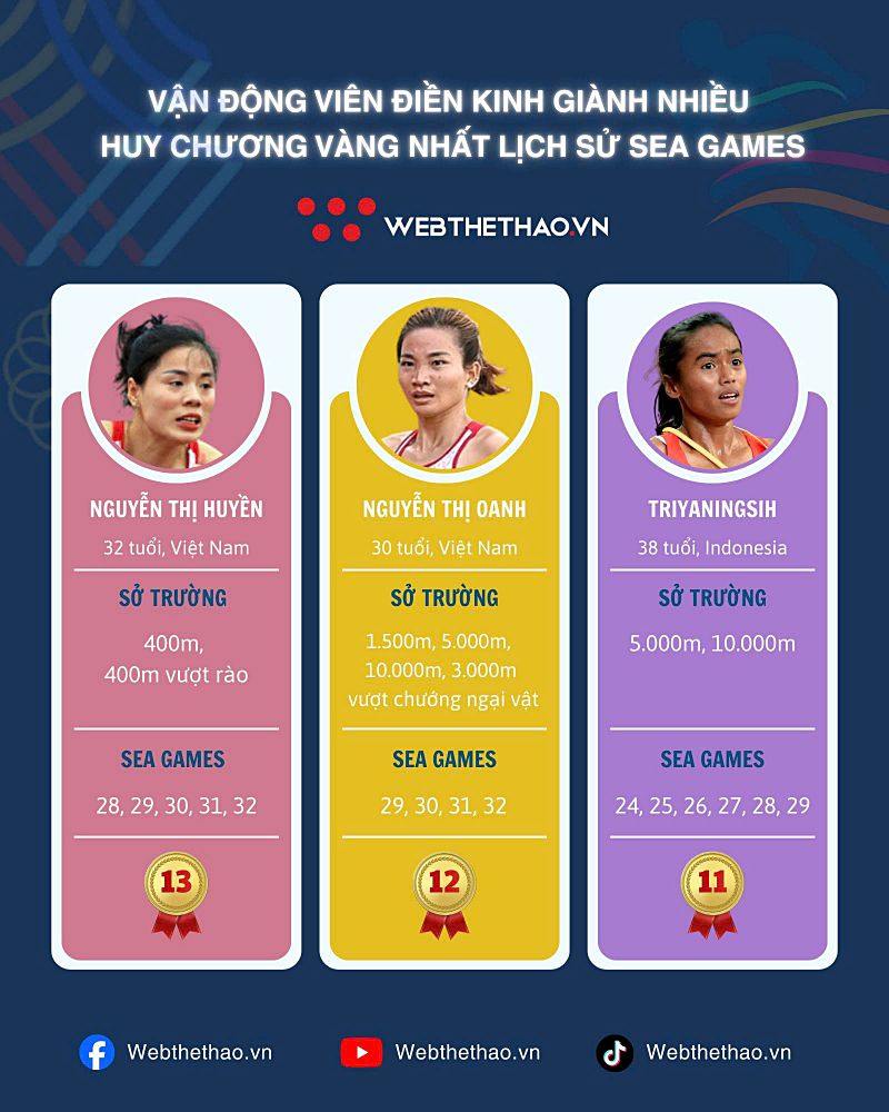 Tính đến thời điểm hiện tại, kỷ lục gia đang nắm giữ số lượng HCV nhiều nhất là Nguyễn Thị Huyền với 13 tấm. Nhưng đàn chị Nguyễn Thị Huyền chính thức giã từ đường chạy sau SEA Games 32, và giờ cơ hội để xô đổ kỷ lục này nằm trong tầm tay Nguyễn Thị Oanh.