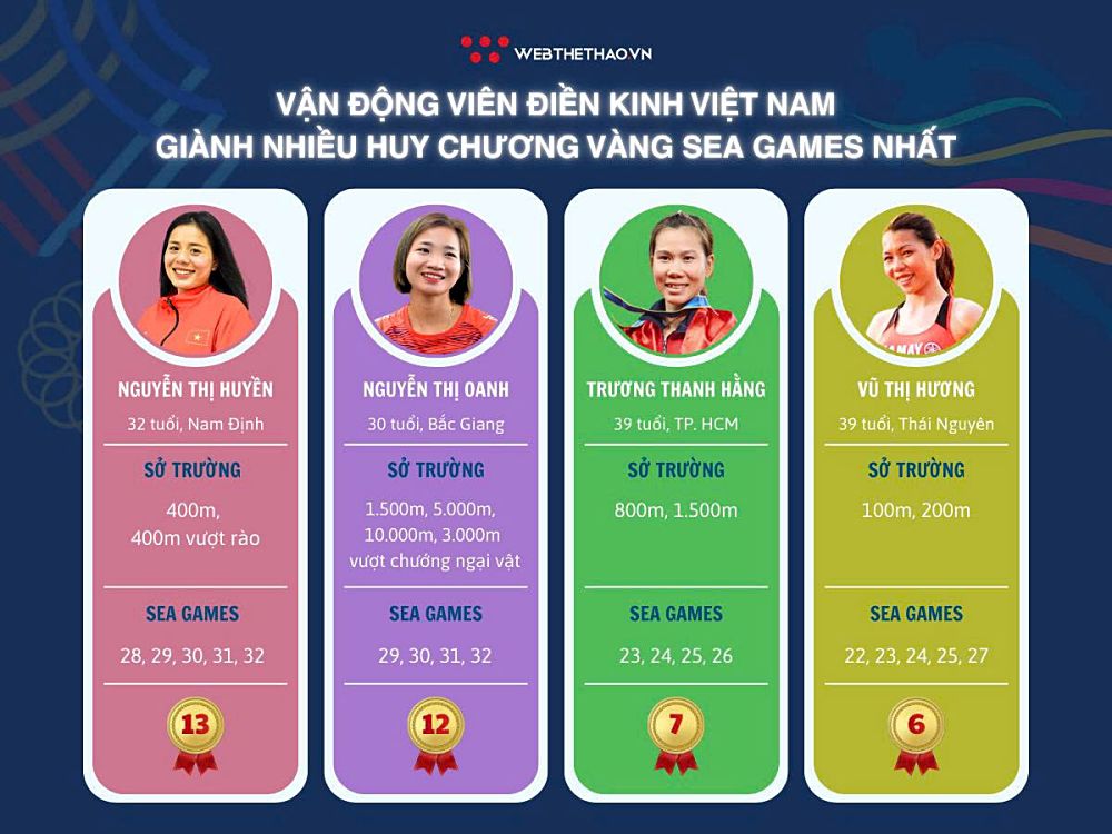 Nhìn lại lịch sử điền kinh Việt Nam tại đấu trường khu vực, những cái tên lẫy lừng như "Nữ hoàng tốc độ" Vũ Thị Hương hay "Nữ hoàng cự ly trung bình" Trương Thanh Hằng đã dừng lại ở con số lần lượt là 6 và 7 HCV trước khi giải nghệ.