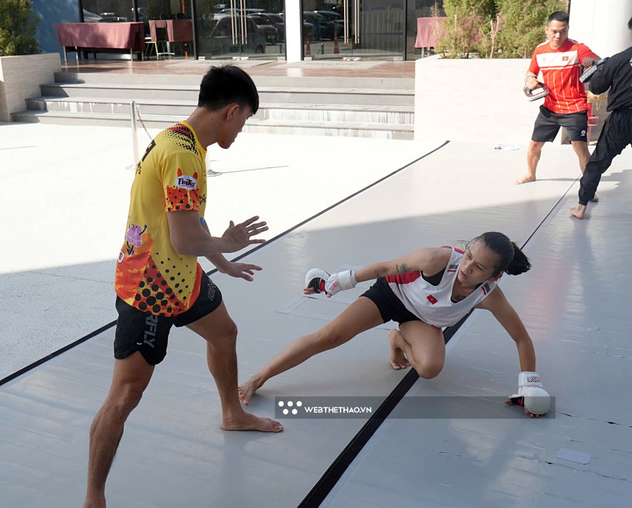 Sau khi di chuyển sang Bangkok, Thái Lan vào chiều qua 8-12, ngay trong sáng nay đội tuyển võ thuật tổng hợp (MMA) Việt Nam đã tập luyện để chuẩn bị sẵn sàng thi đấu tại SEA Games 33. Không khó để nhận ra tượng đài làng võ Nguyễn Trần Duy Nhất trong vài trò HLV, đang "luyện công" cho học trò Lê Ngọc Thu.