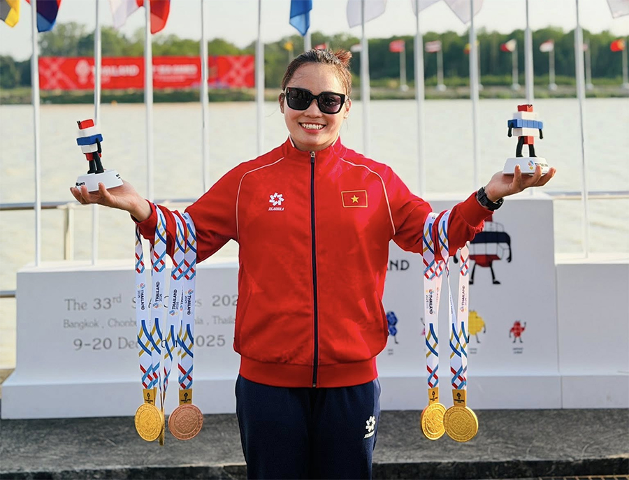Tuyển thủ chèo thuyền Nguyễn Thị Hương là gương mặt tiêu biểu có thành tích giành 4 HCV tại SEA Games 33-2025. Cô đã có 2 tấm HCV trong thi đấu canoeing và 2 HCV trong thi đấu đua thuyền truyền thống (thuyền rồng).